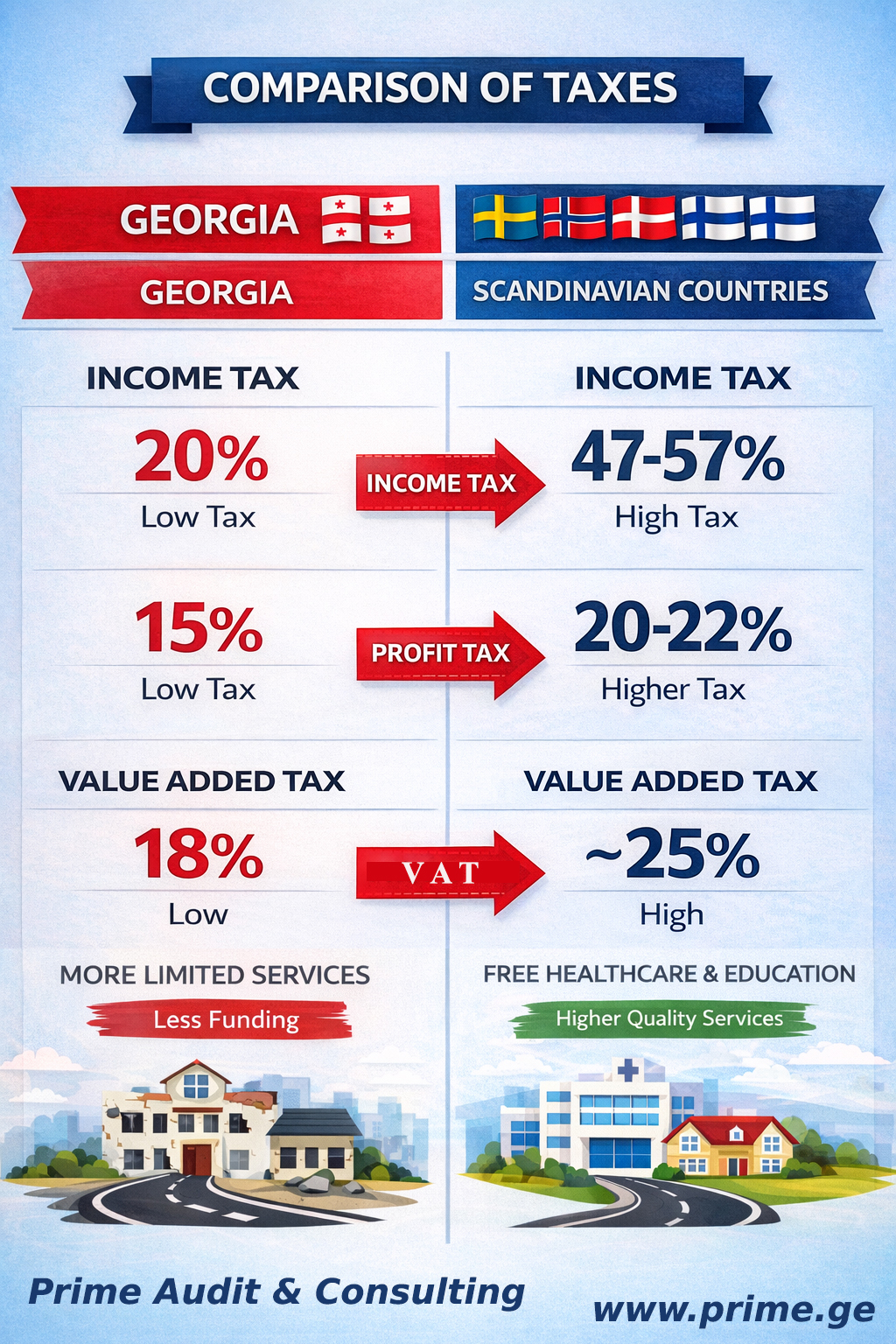 მეტი თვალსაჩინოებისთვის, საქართველო გადასახადების მხრივ შევადაროთ სკანდინავიურ ქვეყნებს. იქ გადასახადები ბევრად უფრო მაღალია, თუმცა ფასები და სერვისები მოსახლეობისთვის ხელმისაწვდომია, რადგან ბაზარი კონკურენტულია, სახელმწიფო ეფექტურად მართავს ფისკალურ პოლიტიკას, ხოლო ანტიმონოპოლიური ზომები მკაცრად უზრუნველყოფილია. სხვა სიტყვებით, მაღალი გადასახადები არა მხოლოდ ეკონომიკისთვის, არამედ მოსახლეობისთვისაც ხელსაყრელია, თუ არსებობს კონკურენცია და ეფექტური სახელმწიფო კონტროლი.